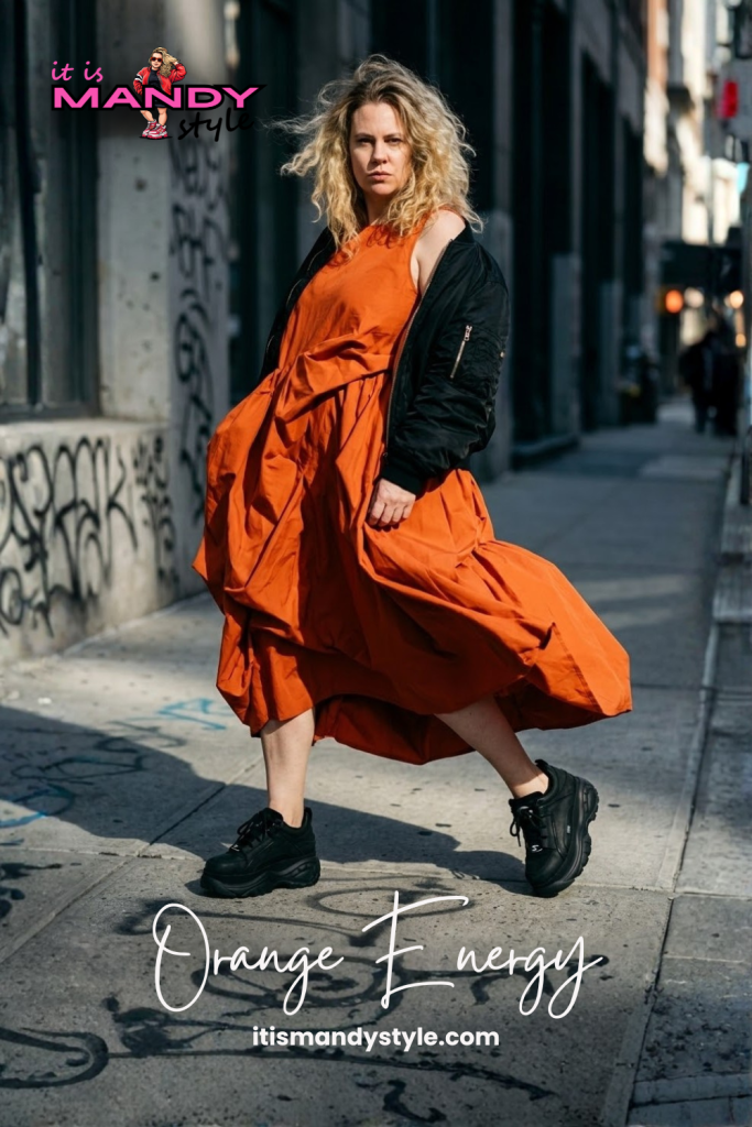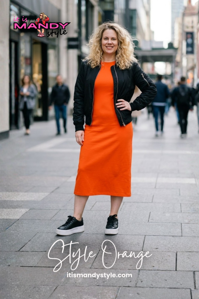 Sneakers onder een jurk: zo stijl je ze vrouwelijk met de kleur oranje.